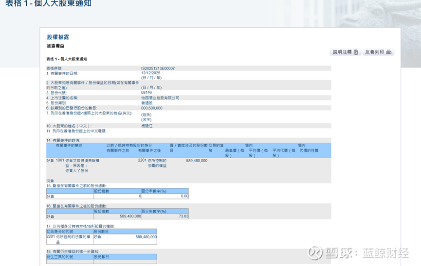 港交所披露易信息显示,杨陵江通过受让股份持有怡园酒业控股有限公司(以下简称:怡园酒业08146.HK)5.9亿股,占比73.6%,成为后者的控股股东与实际控制人。