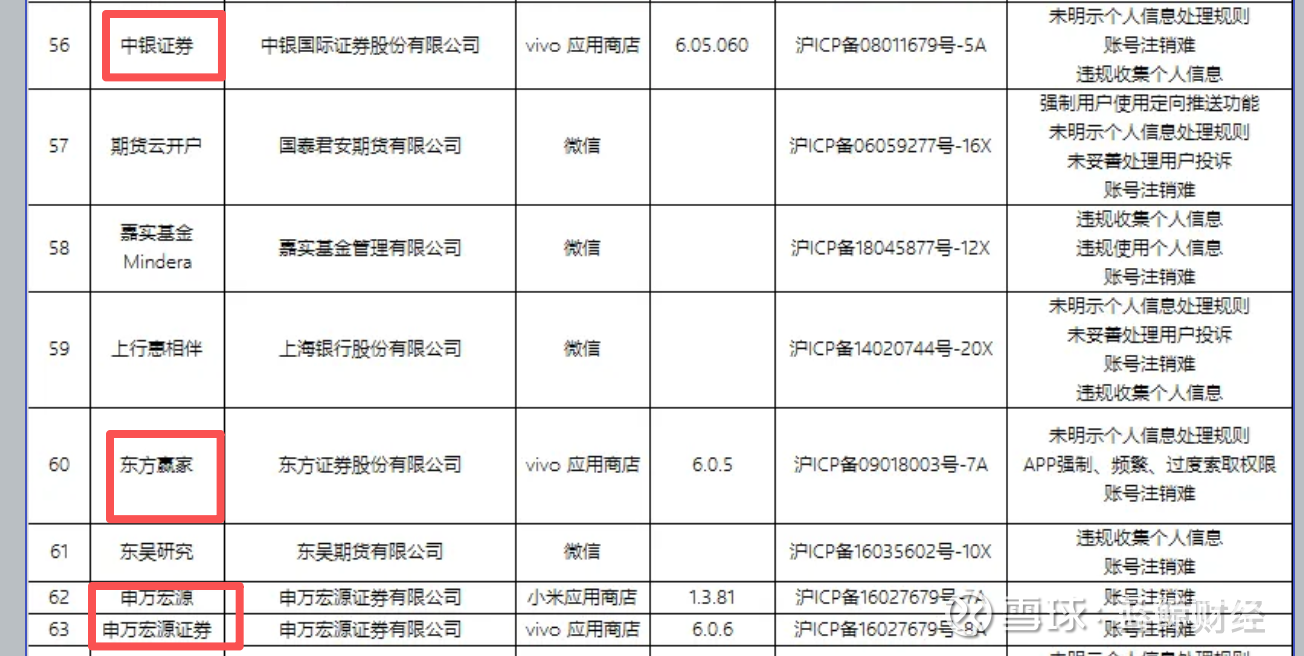 其中,中银证券APP存在未明示个人信息处理规则;账号注销难;违规收集个人信息等问题。申万宏源证券旗下申万宏源、申万宏源证券两款APP则存在账号注销难的问题。东方证券旗下东方赢家存在未明示个人信息处理规则;APP强制、频繁、过度索取权限;账号注销难等问题。
