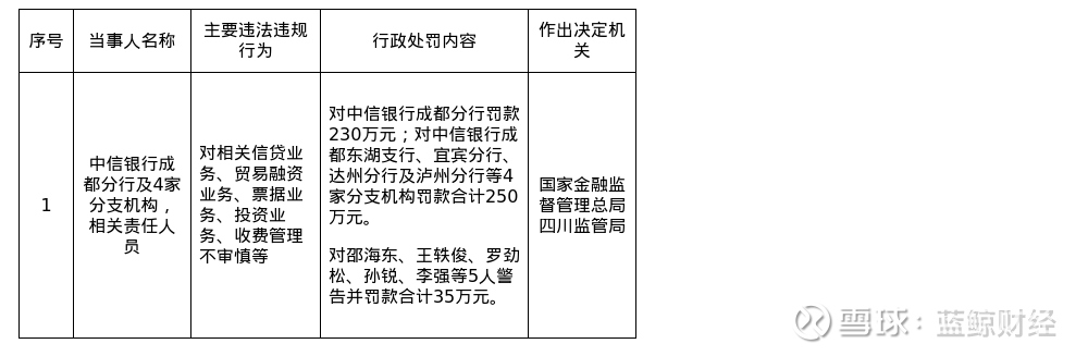 蓝鲸新闻12月18日讯,近日,国家金融监督管理总局四川监管分局发布了行政处罚决定,剑指中信银行成都分行及其4家分支机构、相关责任人。