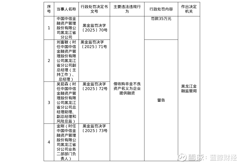 中信金融资产黑龙江分公司被罚35万,涉借收购非金不良资产提供融资