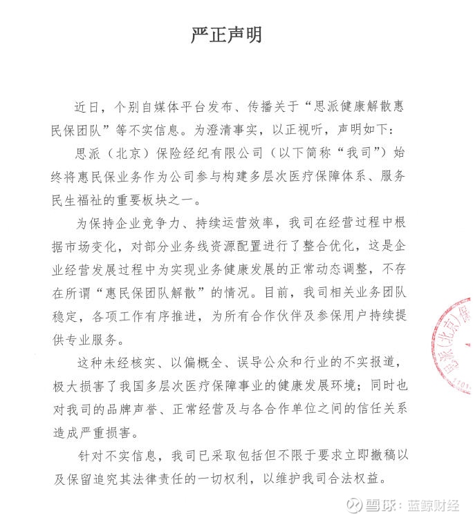 记者拿到的思派健康《严正声明》内容显示,思派(北京)保险经纪有限公司始终将惠民保业务作为公司参与构建多层次医疗保障体系、服务民生福祉的重要板块之一。为保持企业竞争力、持续运营效率,公司在经营过程中根据市场变化,对部分业务线资源配置进行了整合优化,这是企业经营发展过程中为实现业务健康发展的正常动态调整,不存在所谓“惠民保团队解散”的情况。目前,公司相关业务团队稳定,各项工作有序推进,为所有合作伙伴及参保用户持续提供专业服务。