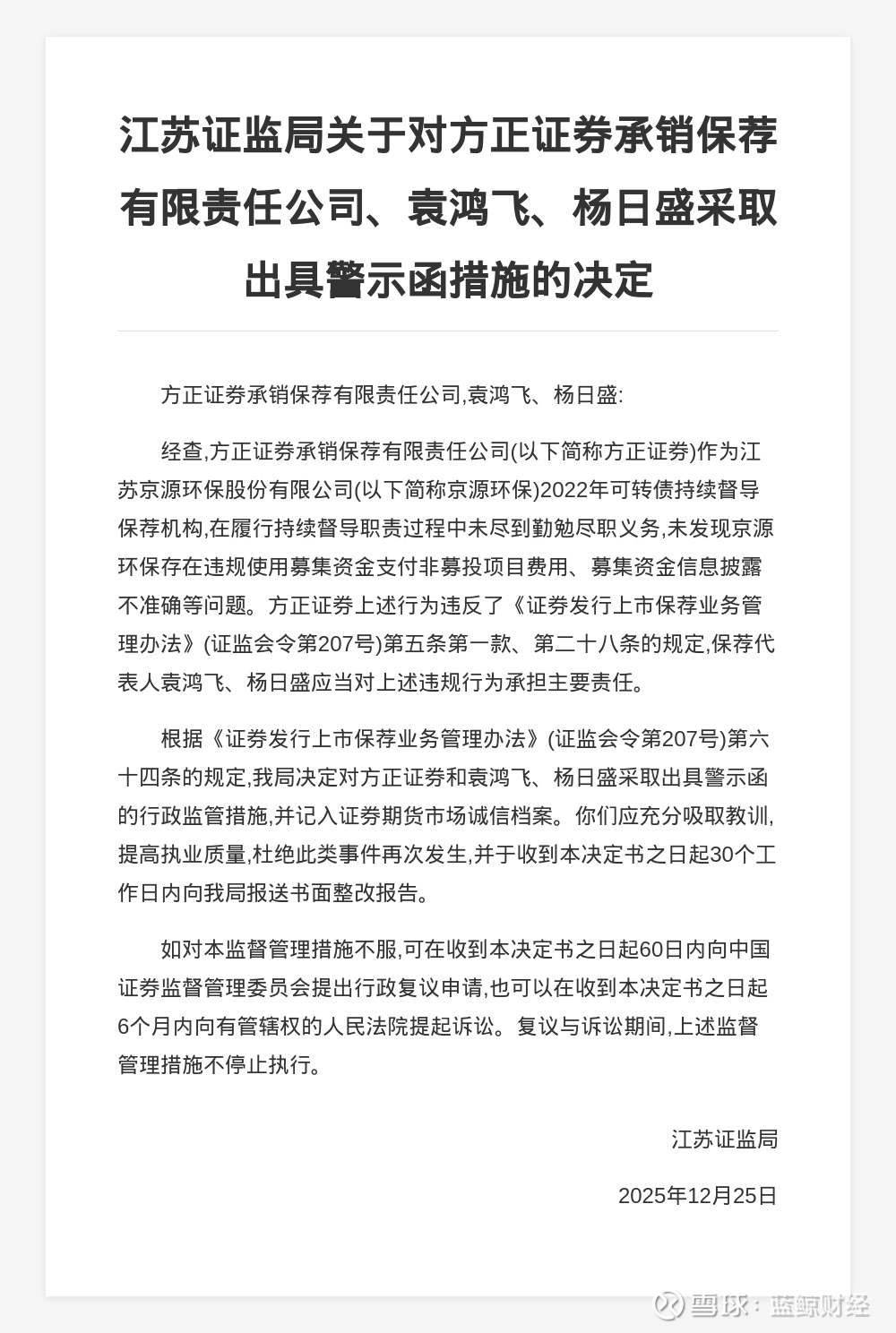 蓝鲸新闻12月27日讯,近日,江苏证监局发布行政监管措施决定书,剑指方正证券承销保荐有限责任公司、袁鸿飞、杨日盛。