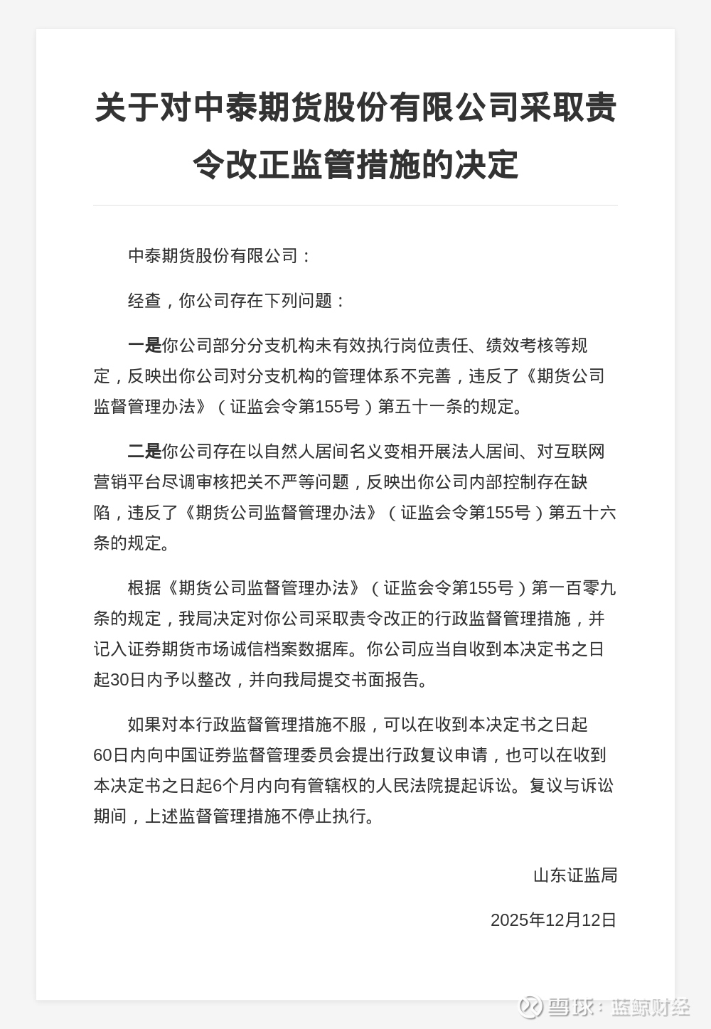 蓝鲸新闻12月27日讯,近日,山东证监局发布行政监管措施决定书,剑指中泰期货股份有限公司。