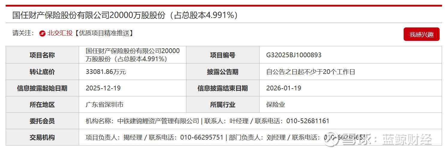 记者注意到,近日,国任财产保险股份有限公司(下称“国任保险”)2亿股股份(占总股本4.991%)在北京产权交易所挂牌出让,转让底价约3.31亿元,股权持有人为公司第五大股东中国铁建投资集团有限公司(下称“中国铁建投资”)。项目披露时间为2025年12月19日至2026年1月19日。