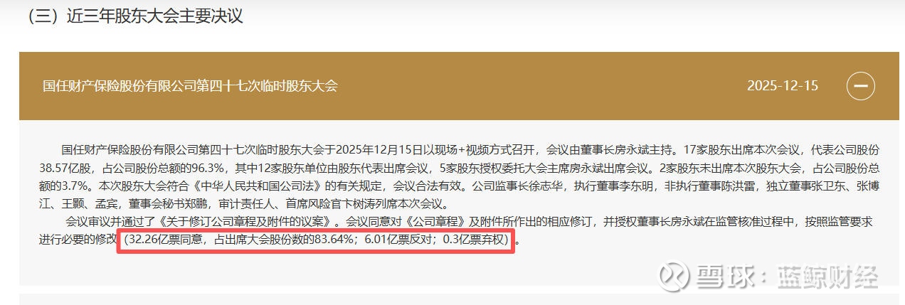 蓝鲸新闻记者根据公司官网信息梳理,2025年12月,国任保险召开第四十七次临时股东大会,会议审议并通过了《关于修订公司章程及附件的议案》。议案虽成功通过,但其中有6.01亿票反对、0.3亿票弃权。