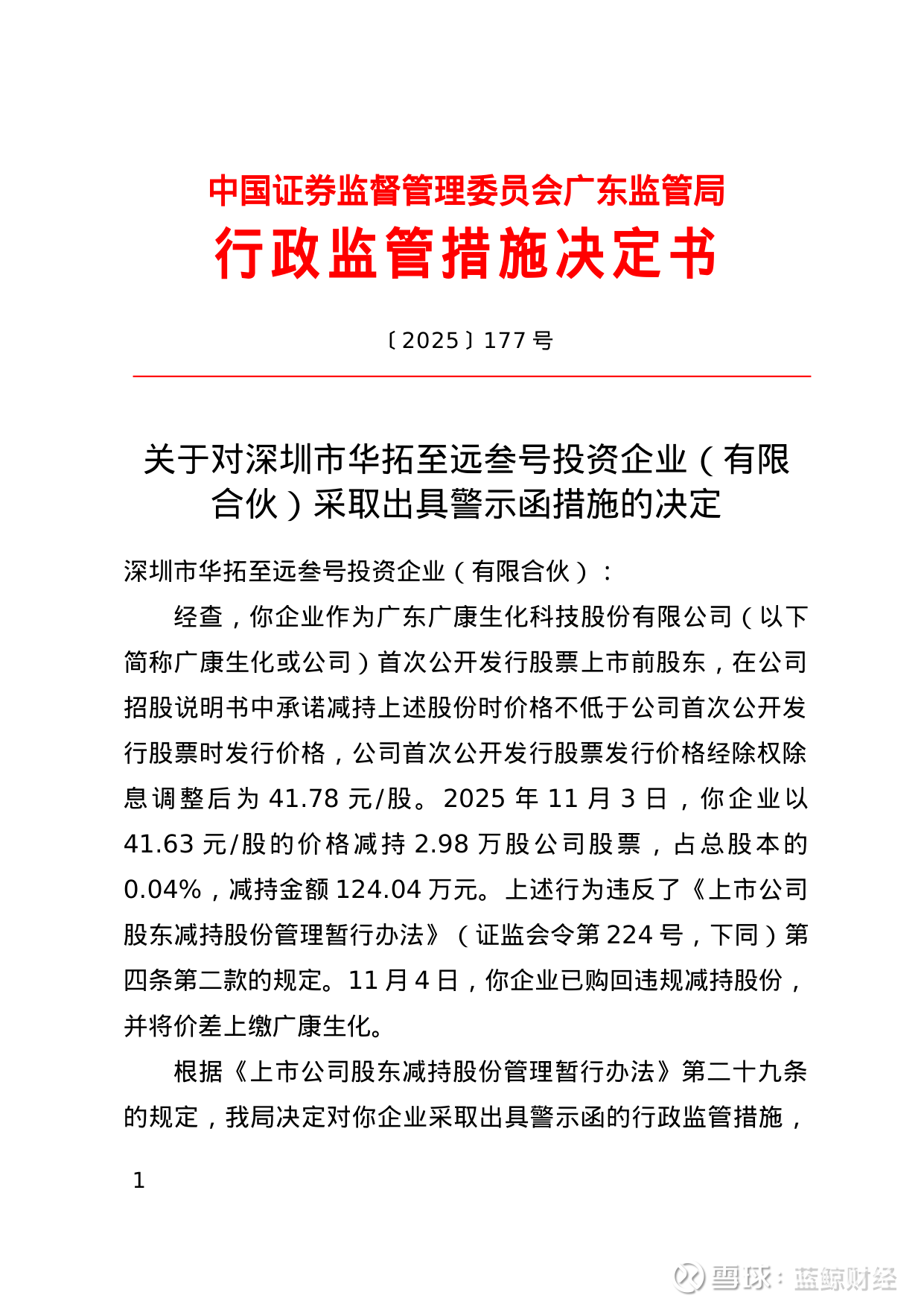 决定书显示,深圳市华拓至远叁号投资企业(有限合伙)作为广东广康生化科技股份有限公司首次公开发行股票上市前股东,在公司招股说明书中承诺减持上述股份时价格不低于公司首次公开发行股票时发行价格,公司首次公开发行股票发行价格经除权除息调整后为41.78元/股。