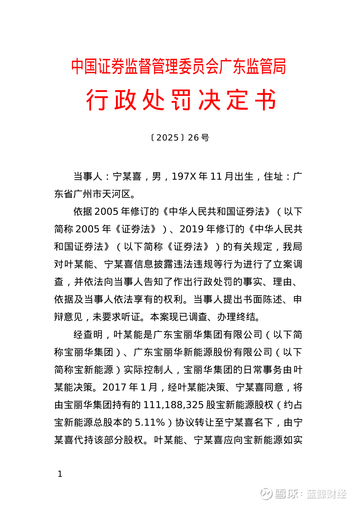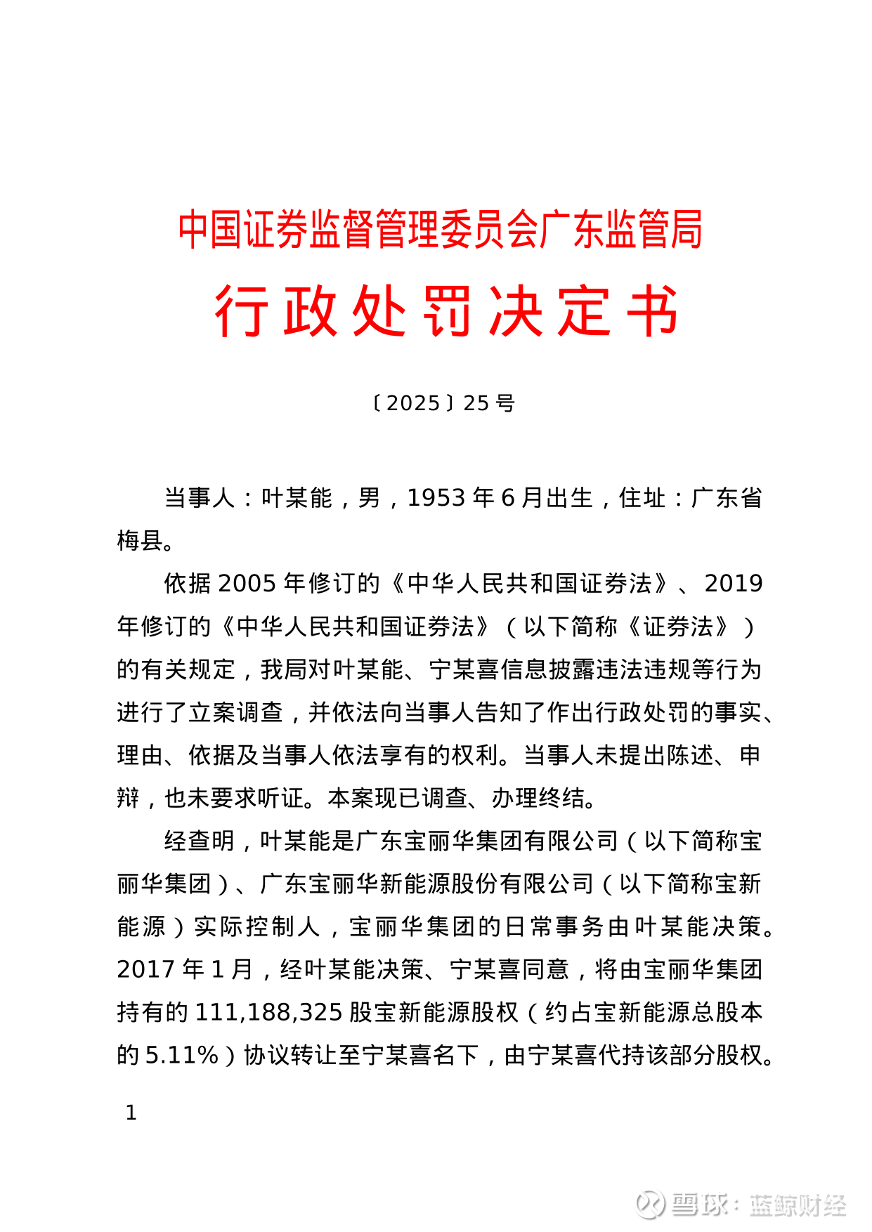 蓝鲸新闻1月12日讯,近日,广东证监局发布了行政处罚决定书,剑指叶某能、宁某喜。