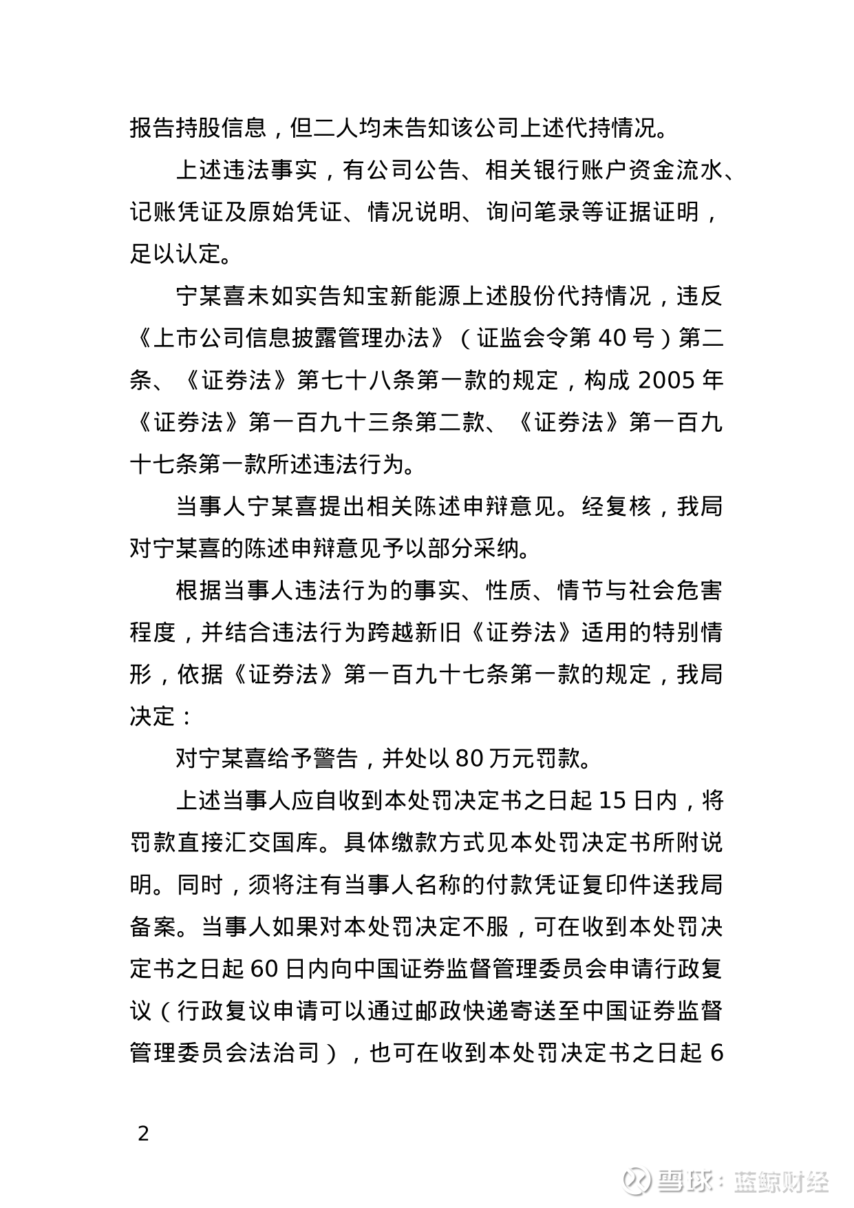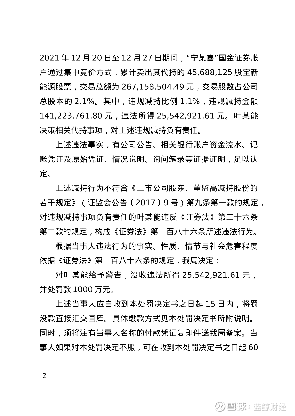 决定书显示,叶某能是广东宝丽华集团有限公司、广东宝丽华新能源股份有限公司实际控制人,宝丽华集团的日常事务由叶某能决策。2017年1月,经叶某能决策、宁某喜同意,将由宝丽华集团持有的111,188,325股宝新能源股权(约占宝新能源总股本的5.11%)协议转让至宁某喜名下,由宁某喜代持该部分股权。2021年12月20日至12月27日期间,“宁某喜”国金证券账户通过集中竞价方式,累计卖出其代持的45,688,125股宝新能源股票,交易总额为267,158,504.49元,交易股数占公司总股本的2.1%。其中,违规减持比例1.1%,违规减持金额141,223,761.80元,违法所得25,542,921.61元。叶某能决策相关代持事项,对上述违规减持负有责任。