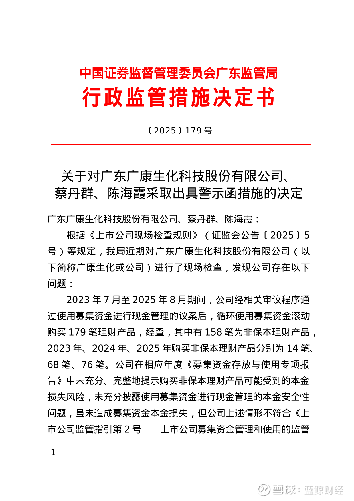 蓝鲸新闻1月12日讯,近日,广东证监局发布行政监管措施决定书,剑指广东广康生化科技股份有限公司、蔡丹群、陈海霞。