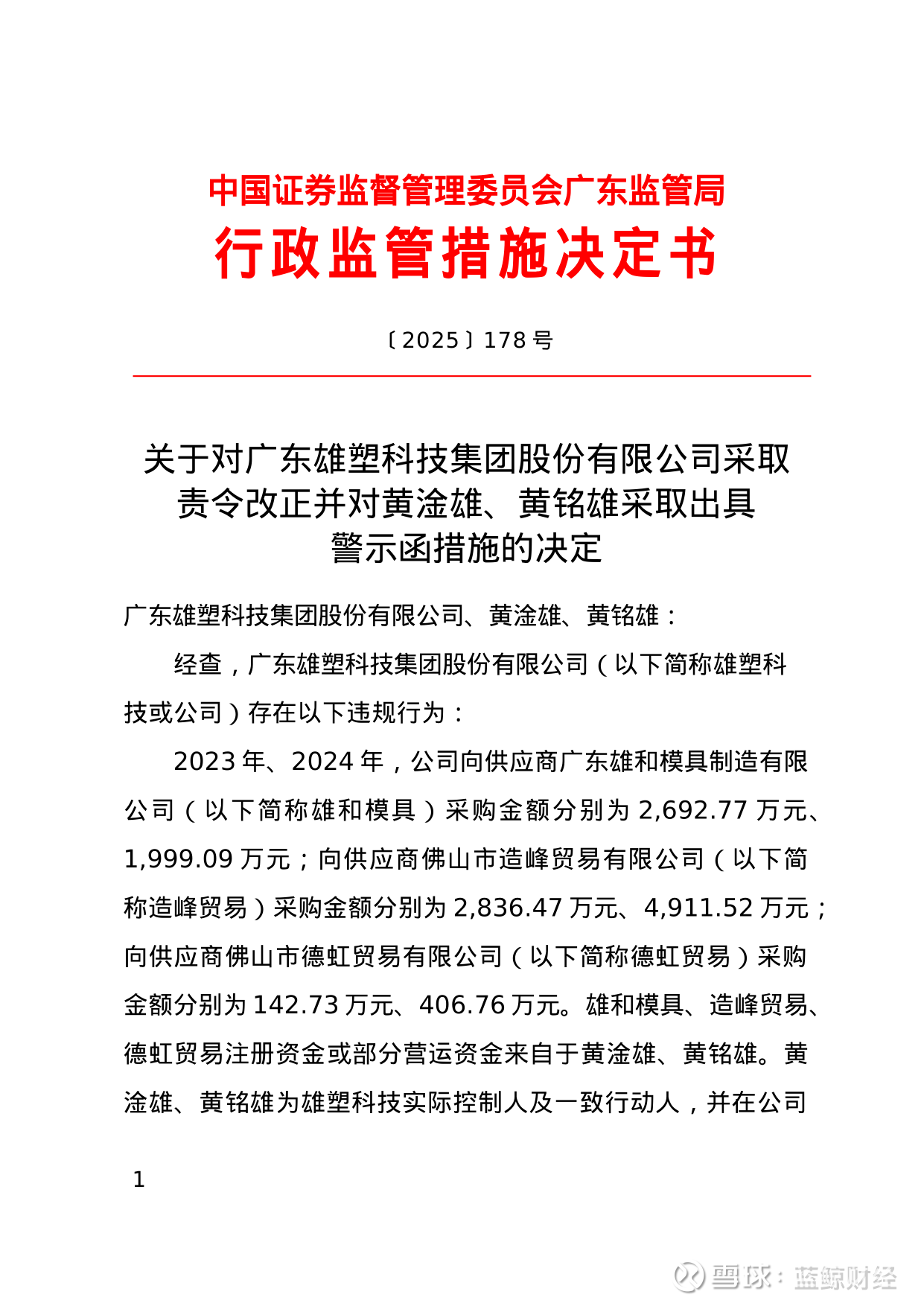 蓝鲸新闻1月13日讯,近日,广东证监局发布了行政监管措施决定书,剑指广东雄塑科技集团股份有限公司及黄淦雄、黄铭雄。