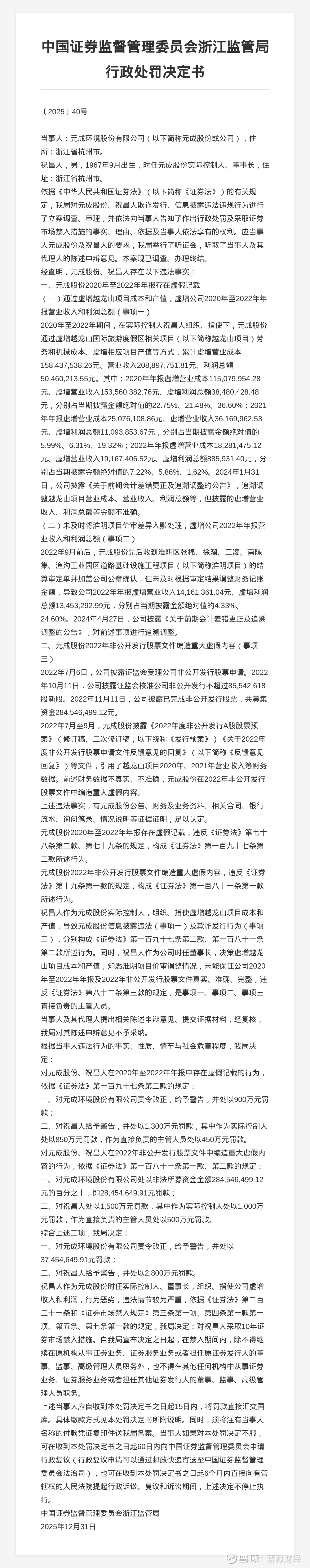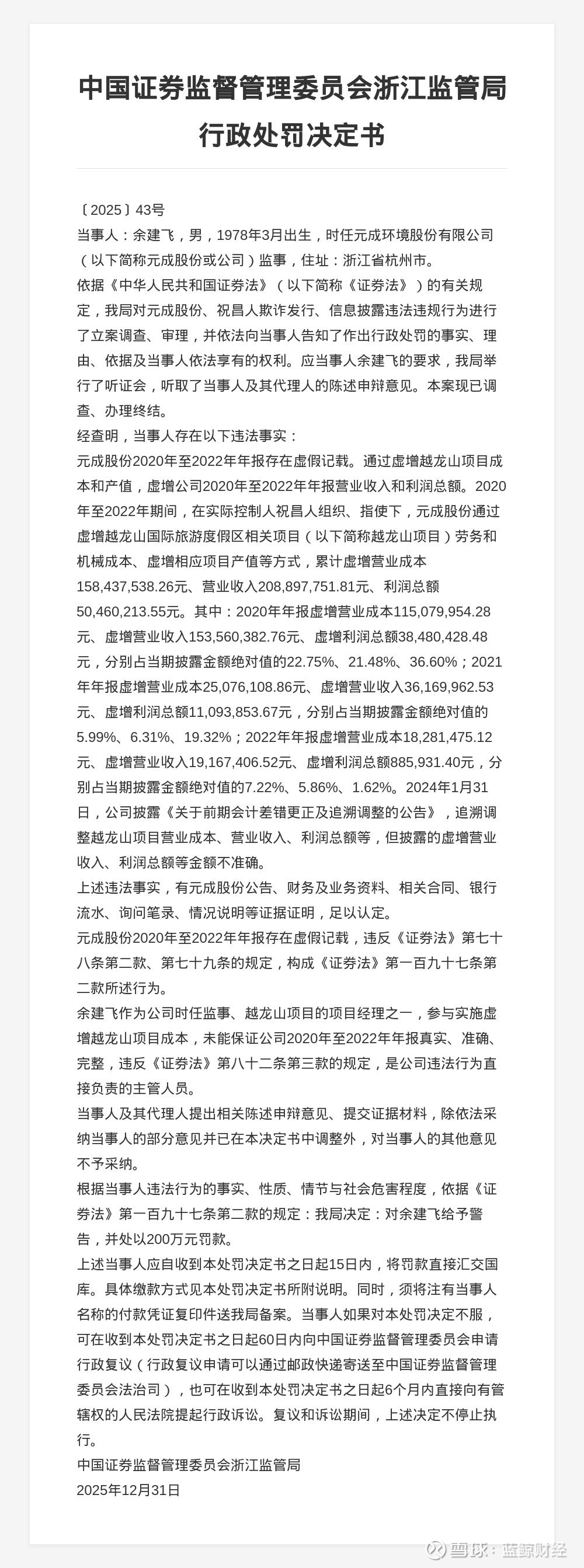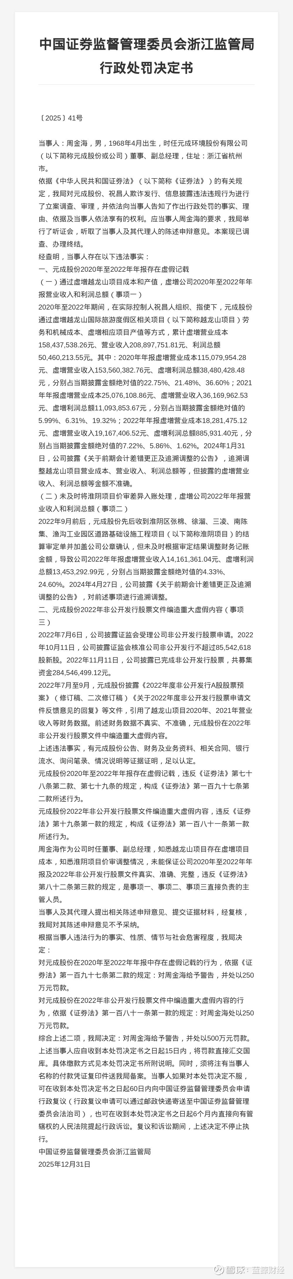 蓝鲸新闻1月13日讯,近日,中国证券监督管理委员会浙江监管局发布行政处罚决定,剑指元成环境股份有限公司及相关责任人。