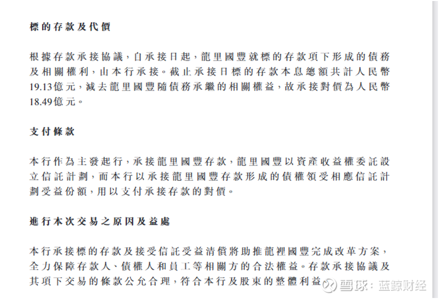 至于这么做的原因,该行表示本行承接标的存款及接受信托受益清偿将助力龙里国丰完成改革方案。全力保障存款人、债权人和员工等相关方的合法权益。存款承接协议及其项下交易的条款公平合理,符合本行及股东的整体利益。