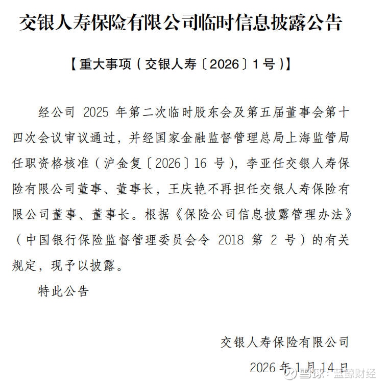 日前,交银人寿保险有限公司(下称“交银人寿”)公告称,经公司2025年第二次临时股东会及第五届董事会第十四次会议审议通过,并经金融监管总局上海监管局任职资格核准,李亚任交银人寿董事、董事长,王庆艳不再担任交银人寿董事、董事长。记者注意到,目前交银人寿官网已将高管名单同步更新。