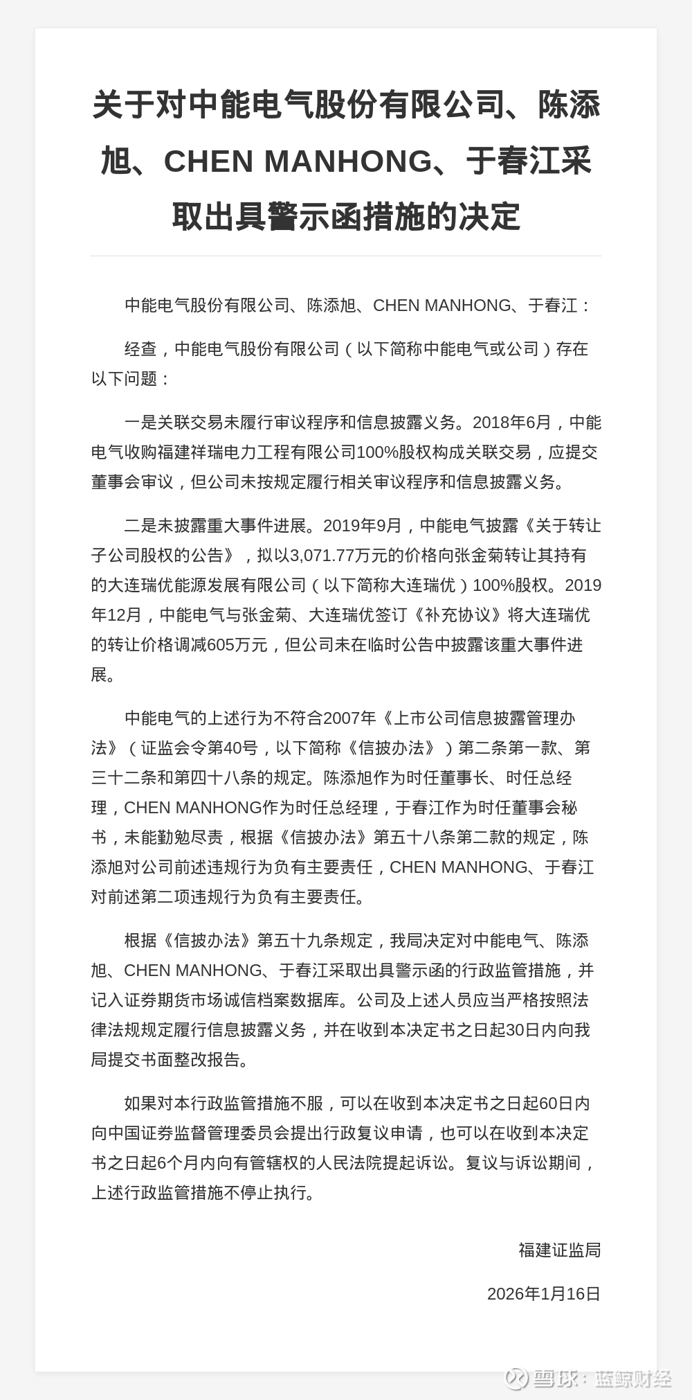 蓝鲸新闻1月19日讯,近日,福建证监局发布行政监管措施决定书,剑指中能电气股份有限公司、陈添旭、CHENMANHONG、于春江。