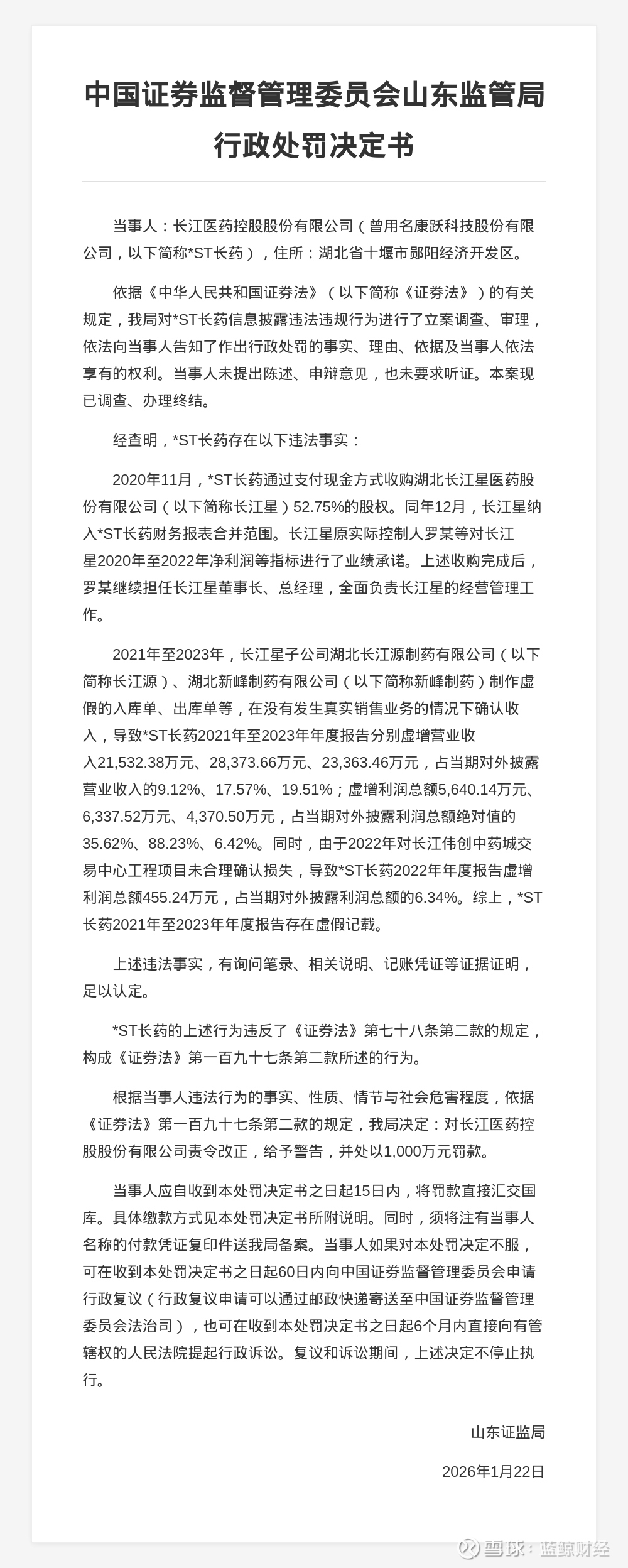 蓝鲸新闻1月26日讯,近日,山东证监局发布行政处罚决定书,剑指长江医药控股股份有限公司(曾用名康跃科技股份有限公司,以下简称*ST长药)。