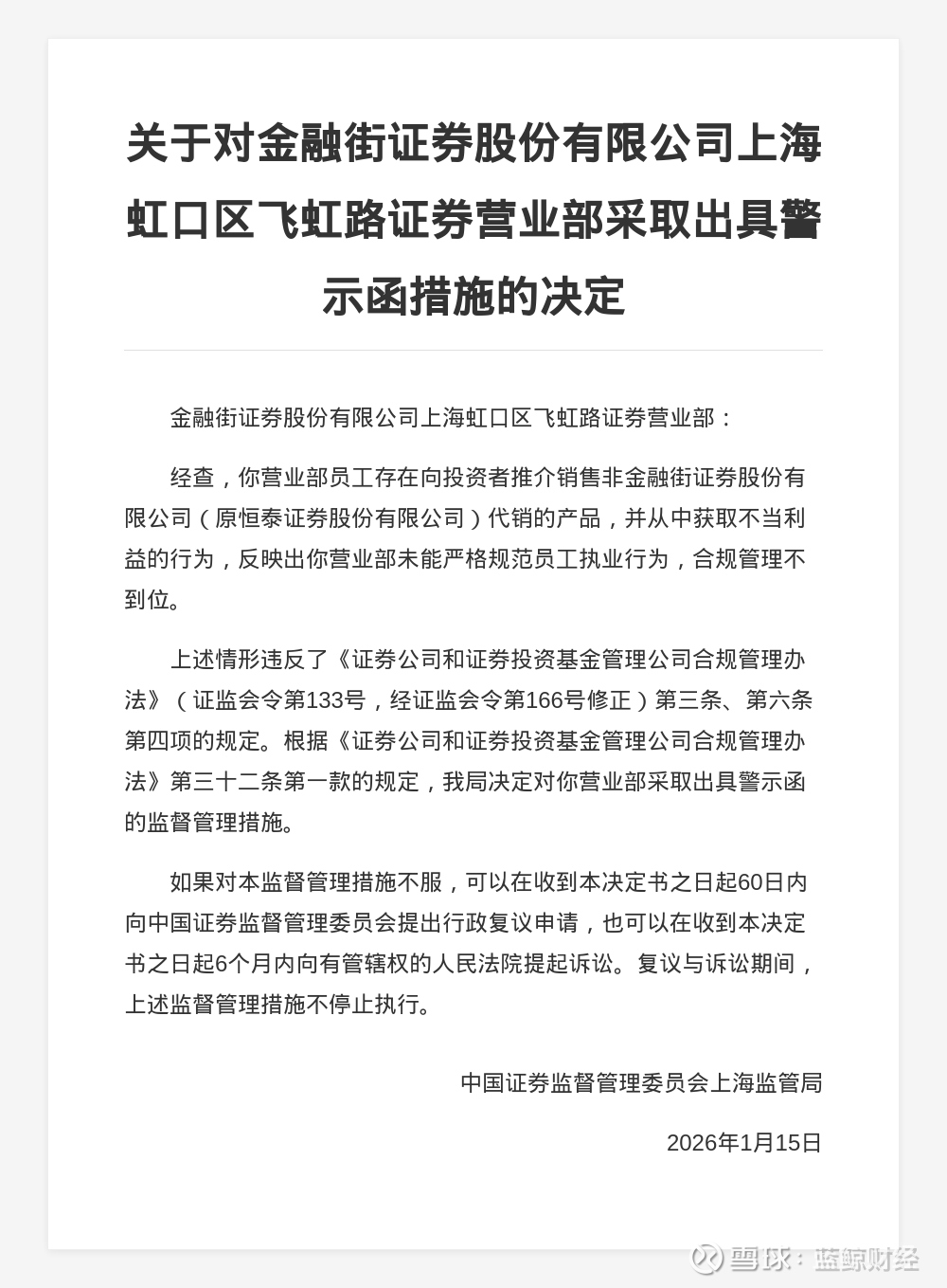 蓝鲸新闻1月28日讯,近日,中国证券监督管理委员会上海监管局发布行政监管措施决定书,剑指金融街证券股份有限公司上海虹口区飞虹路证券营业部。