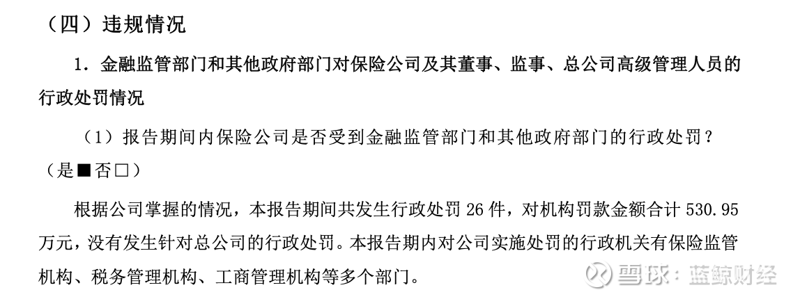 违规及处罚情况显示,根据公司掌握的情况,报告期内,国寿财险共收到26件行政处罚,机构罚款合计530.95万元,无针对总公司的处罚。对公司实施处罚的行政机关有保险监管机构、税务管理机构、工商管理机构等多个部门。