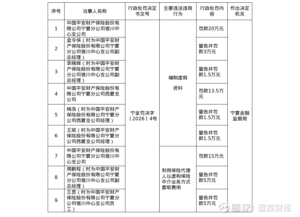 此外,中国平安财产保险股份有限公司宁夏分公司西夏支公司因编制虚假资料,被罚款13.5万元;经理杨浩被警告并处罚款1.5万元;经理王斌被警告并处罚款1.5万元。