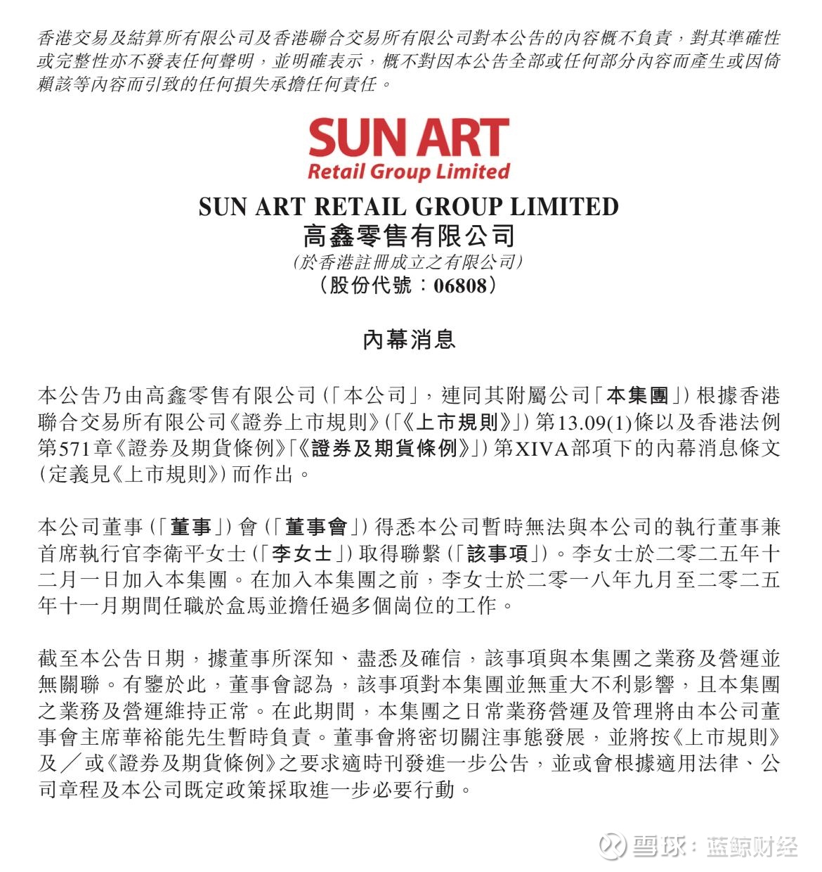 蓝鲸新闻2月4日讯(记者 孙煜)今日早间,高鑫零售(6808.HK)在港交所发布公告,公司董事会得悉本公司暂时无法与本公司的执行董事兼首席执行官(CEO)李卫平取得联系。