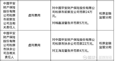 此外,中国平安财产保险股份有限公司松原市扶余公司也因虚列费用,被罚款22万元;相关责任人王海龙被警告并罚款4万元。