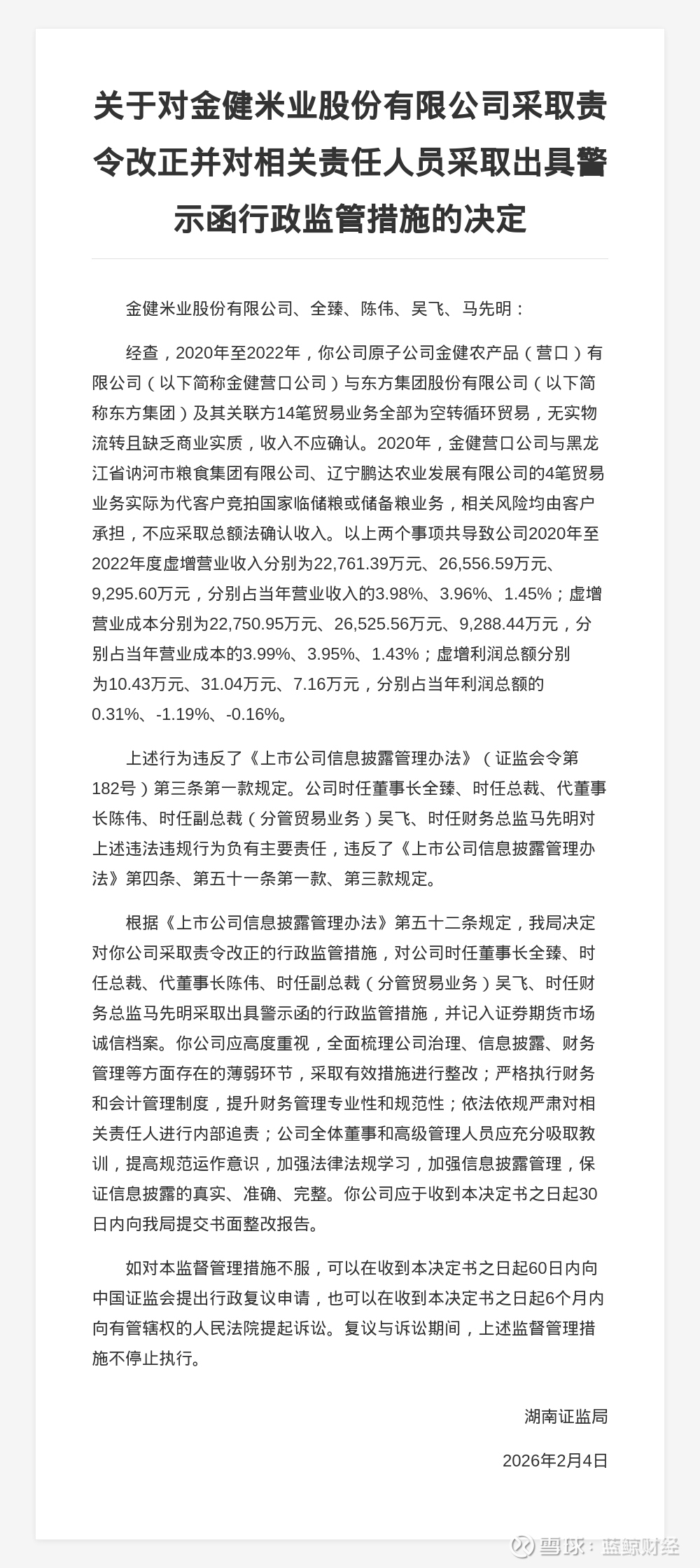 对此,湖南证监局决定对金健米业股份有限公司采取责令改正的行政监管措施,对公司时任董事长全臻、时任总裁、代董事长陈伟、时任副总裁(分管贸易业务)吴飞、时任财务总监马先明采取出具警示函的行政监管措施,并记入证券期货市场诚信档案。