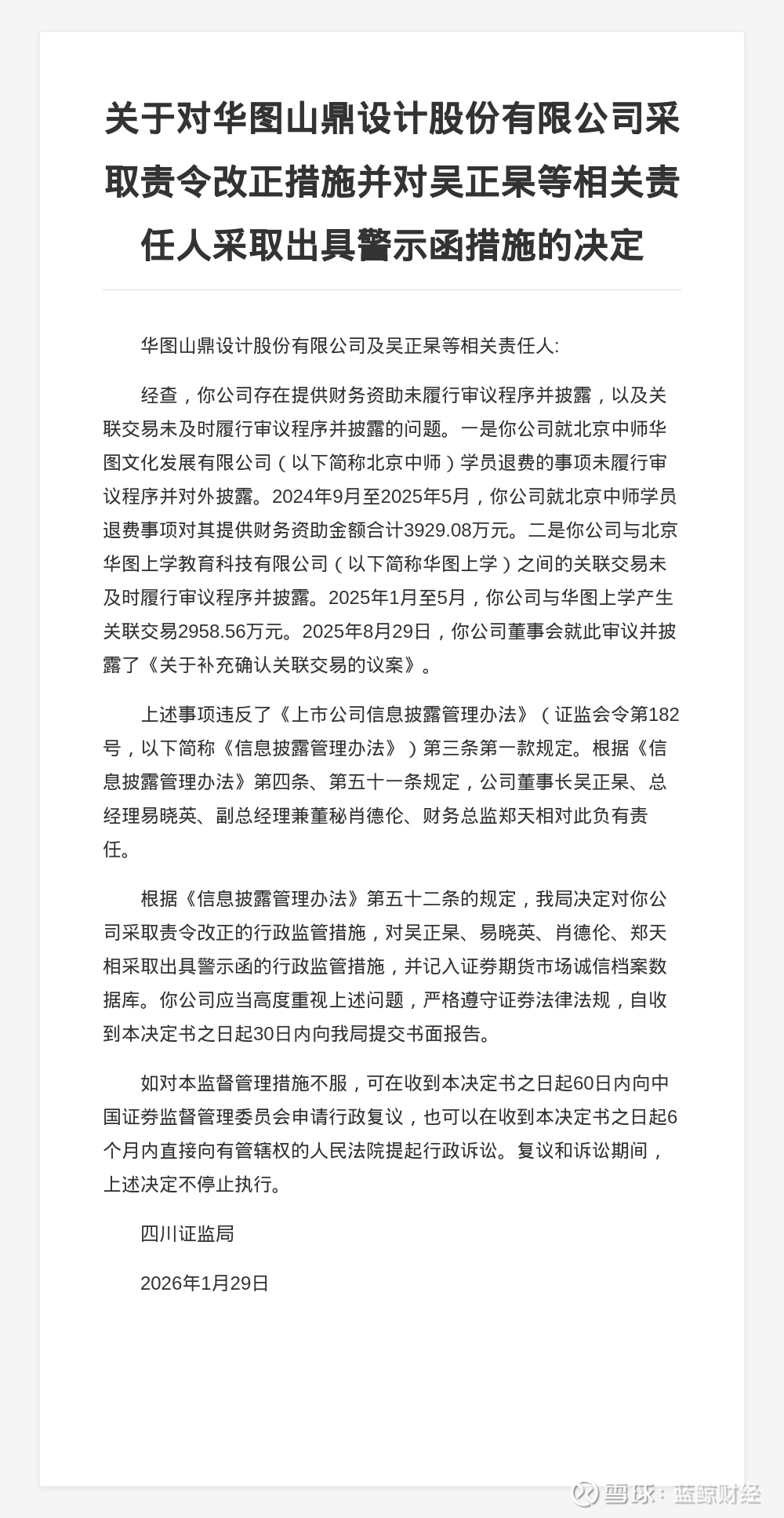 蓝鲸新闻2月9日讯,近日,四川证监局发布行政监管措施决定书,剑指华图山鼎设计股份有限公司及相关责任人。