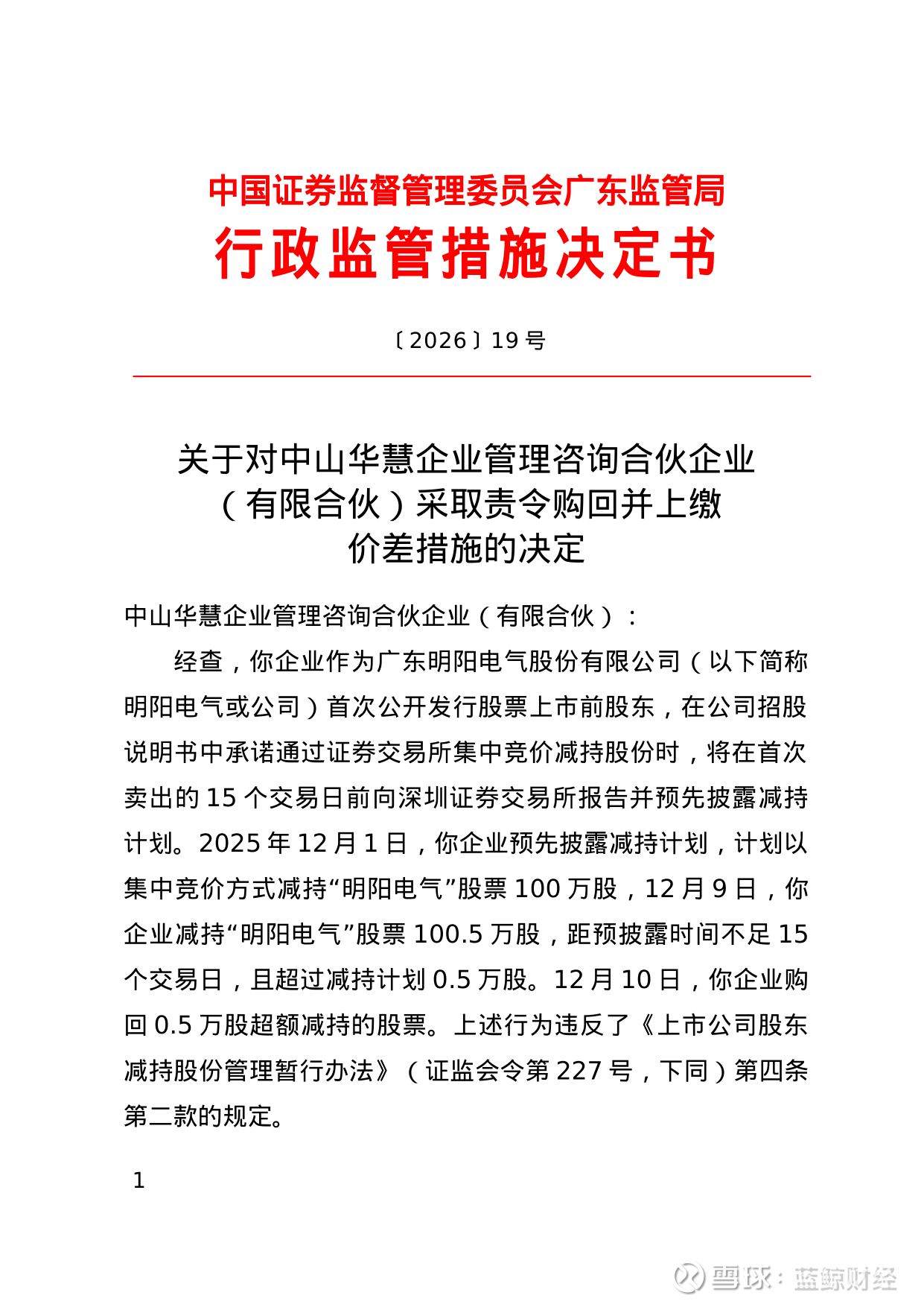 决定书显示,中山华慧企业管理咨询合伙企业(有限合伙)作为广东明阳电气股份有限公司首次公开发行股票上市前股东,在公司招股说明书中承诺通过证券交易所集中竞价减持股份时,将在首次卖出的15个交易日前向深圳证券交易所报告并预先披露减持计划。2025年12月1日,企业预先披露减持计划,计划以集中竞价方式减持“明阳电气”股票100万股,12月9日,企业减持“明阳电气”股票100.5万股,距预披露时间不足15个交易日,且超过减持计划0.5万股。12月10日,企业购回0.5万股超额减持的股票。