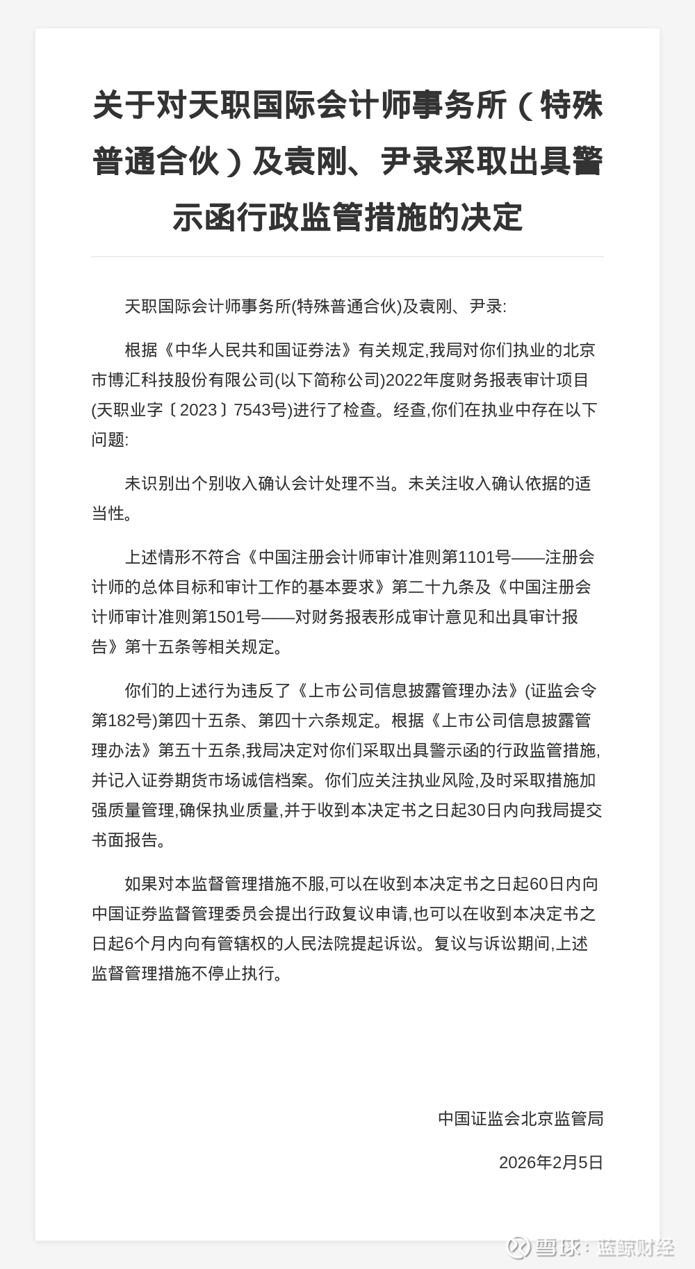 蓝鲸新闻2月13日讯,近日,中国证监会北京监管局发布行政监管措施决定书,剑指天职国际会计师事务所(特殊普通合伙)及注册会计师袁刚、尹录。