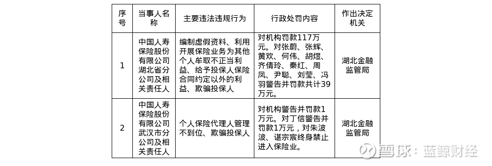 蓝鲸新闻2月14日讯,近日,国家金融监督管理总局湖北监管分局发布了多张罚单,剑指中国人寿保险股份有限公司湖北省分公司及其相关责任人。