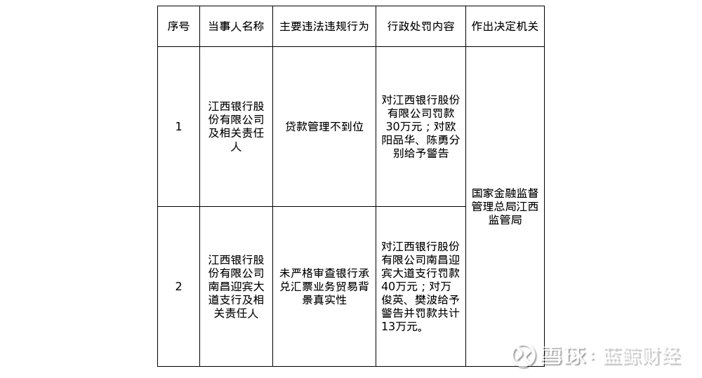 蓝鲸新闻2月26日讯,近日,国家金融监督管理总局江西监管局发布了罚单,剑指江西银行股份有限公司、南昌迎宾大道支行及相关责任人。