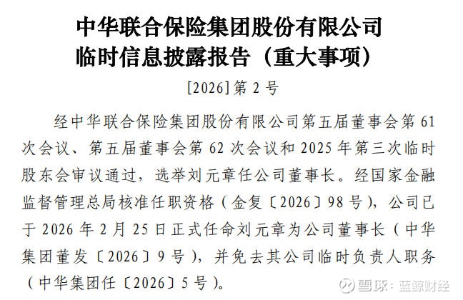 蓝鲸新闻3月2日讯(记者 陈晓娟)记者关注到,据中华联合保险集团股份有限公司(下称“中华联合保险”)官网,经中华联合保险集团董事会会议和股东会审议通过,并经金融监管总局核准任职资格,公司已于2026 年2月25日正式任命刘元章为公司董事长,并免去其公司临时负责人职务。