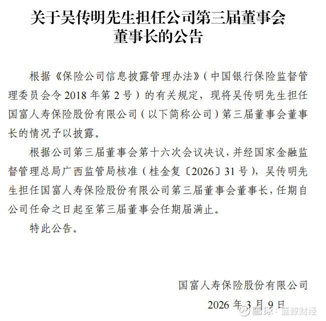 蓝鲸新闻3月11日讯(记者 陈晓娟)国富人寿保险股份有限公司(下称“国富人寿”)新任董事长落地。日前,该公司公告,吴传明担任公司第三届董事会董事长,任期自公司任命之日起至第三届董事会任期届满止。需关注的是,国富人寿成立八年间已迎来第四任董事长,更迭频繁。