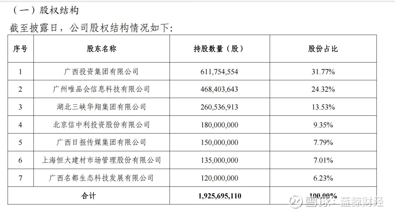 从股权结构看,广投集团以31.77%持股比例位列国富人寿第一大股东;广州唯品会信息科技有限公司(下称“唯品会”)持股24.32%,为第二大股东;湖北三峡华翔集团有限公司持股13.53%,位居第三。其余主要股东包括北京信中利投资股份有限公司(持股9.35%)、广西日报传媒集团有限公司(持股7.79%)、上海恒大建材市场管理股份有限公司(持股7.01%,下称“上海恒大建材”)和广西名都生态科技发展有限公司(持股6.23%)。