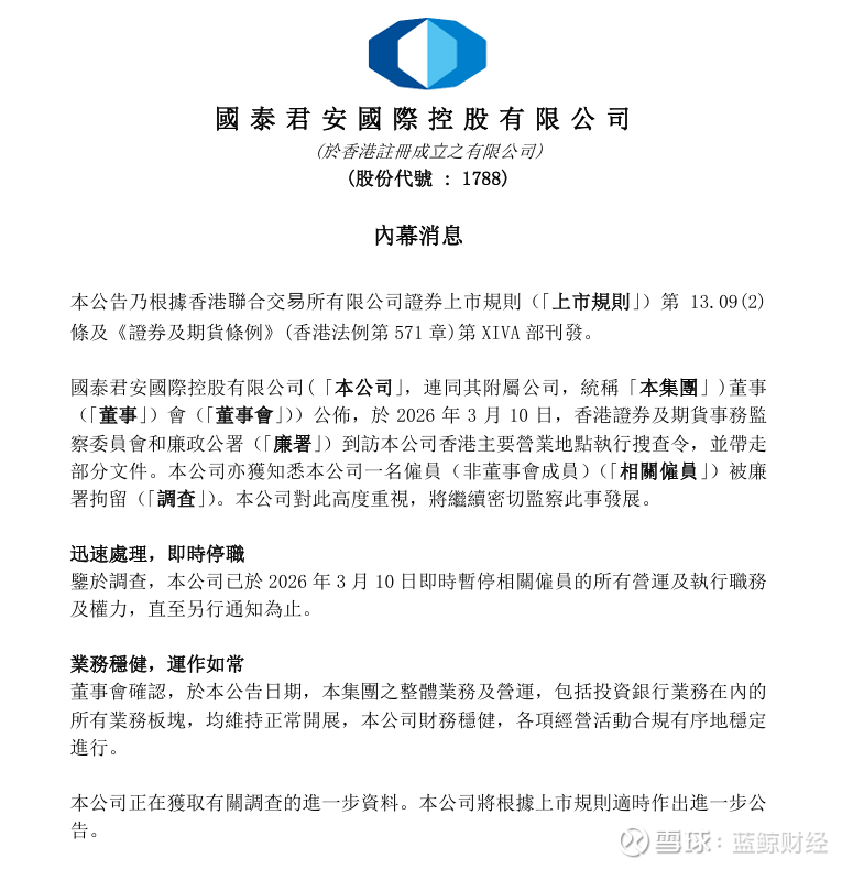 蓝鲸新闻3月12日讯(记者 胡劼)今日早间,国泰君安国际发布公告称,3月10日,香港证券及期货事务监察委员会和廉政公署到访公司香港主要营业地点执行搜查令,并带走部分文件。公司亦获知悉公司一名雇员(非董事会成员)被廉署拘留。公司对此高度重视,将继续密切监察此事发展。