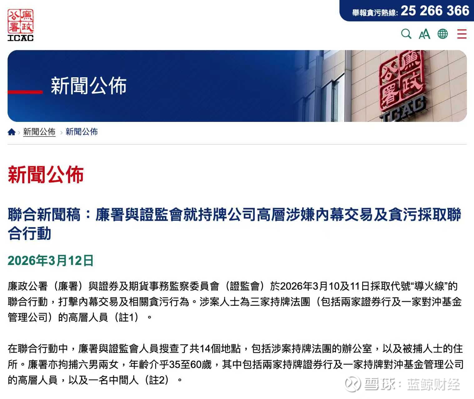 蓝鲸新闻3月12日讯(记者 王婉莹)香港廉政公署今日公告称,香港廉政公署与证券及期货事务监察委员会于3月10日及11日展开代号为“Fuse”的联合行动,针对涉嫌内幕交易及贪污腐败行为进行调查。