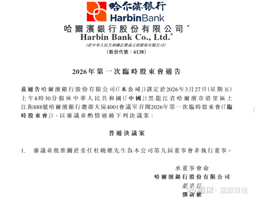 蓝鲸新闻3月12日讯(记者 金磊)近日,哈尔滨银行(6138.HK)发布公告,将于3月27日召开2026年第一次临时股东会审议关于委任杜晓权为公司第九届董事会非执行董事的议案。