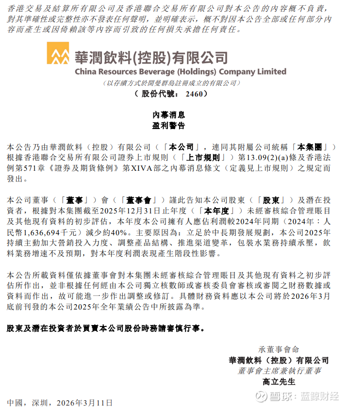 对于利润预警的原因,华润饮料在公告中称,2025年公司持续主动加大营销投入力度、调整产品结构、推进渠道变革,包装水业务持续承压,饮料业务增速不及预期,对年度利润表现产生阶段性影响。