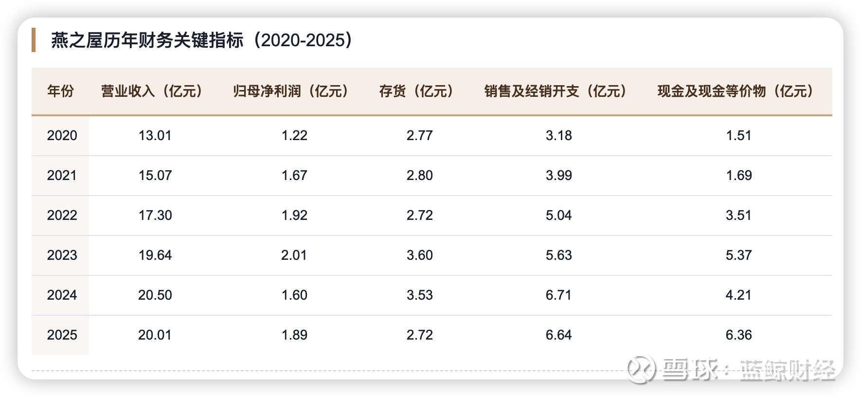 从历年数据走势可以看出,燕之屋的营收增速已明显放缓——从2021年的15.82%逐年下滑至2025年的负增长。2024年公司出现五年来首次利润下滑,净利润同比下降24.18%。存货在2023年达到3.6亿元高点后逐步回落,2025年降至2.7亿元,显示出公司在主动去库存。此外,现金及现金等价物自2023年达到5.37亿元峰值后有所回落,2025年回升至6.36亿元。