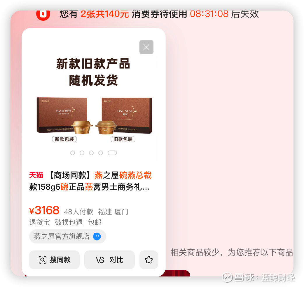 2025年3月,燕之屋尝试开拓新赛道,引入万科创始人王石为品牌代言人,推出“总裁碗燕”,试图切入男性高净值市场。这款产品融合燕窝、铁皮石斛、长白人参等八种原料,统一零售价3168元/盒(6碗装),单价高达528元/碗。然而蓝鲸记者注意到,截至2026年3月19日,该产品在天猫官方旗舰店上仅48人付款,销量仅超过100盒。