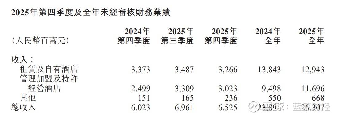 这背后,华住今年来自有酒店规模收缩,加盟模式成为业绩增长的主要引擎。公告显示,2025年全年华住来自租赁及自有酒店的收入为129亿元,同比下降6.5%;来自管理加盟及特许经营酒店的收入为117亿元,同比增长23.1%。