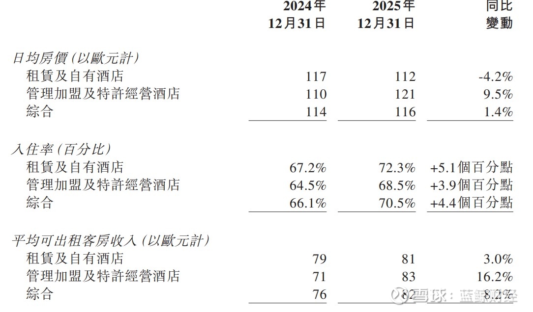 华住国际方面,全年ADR为116欧元,同比增长1.4%;入住率70.5%,同比增长4.4个百分点;RevPAR达82欧元,同比增长8.2%,海外市场运营能力稳步提升。