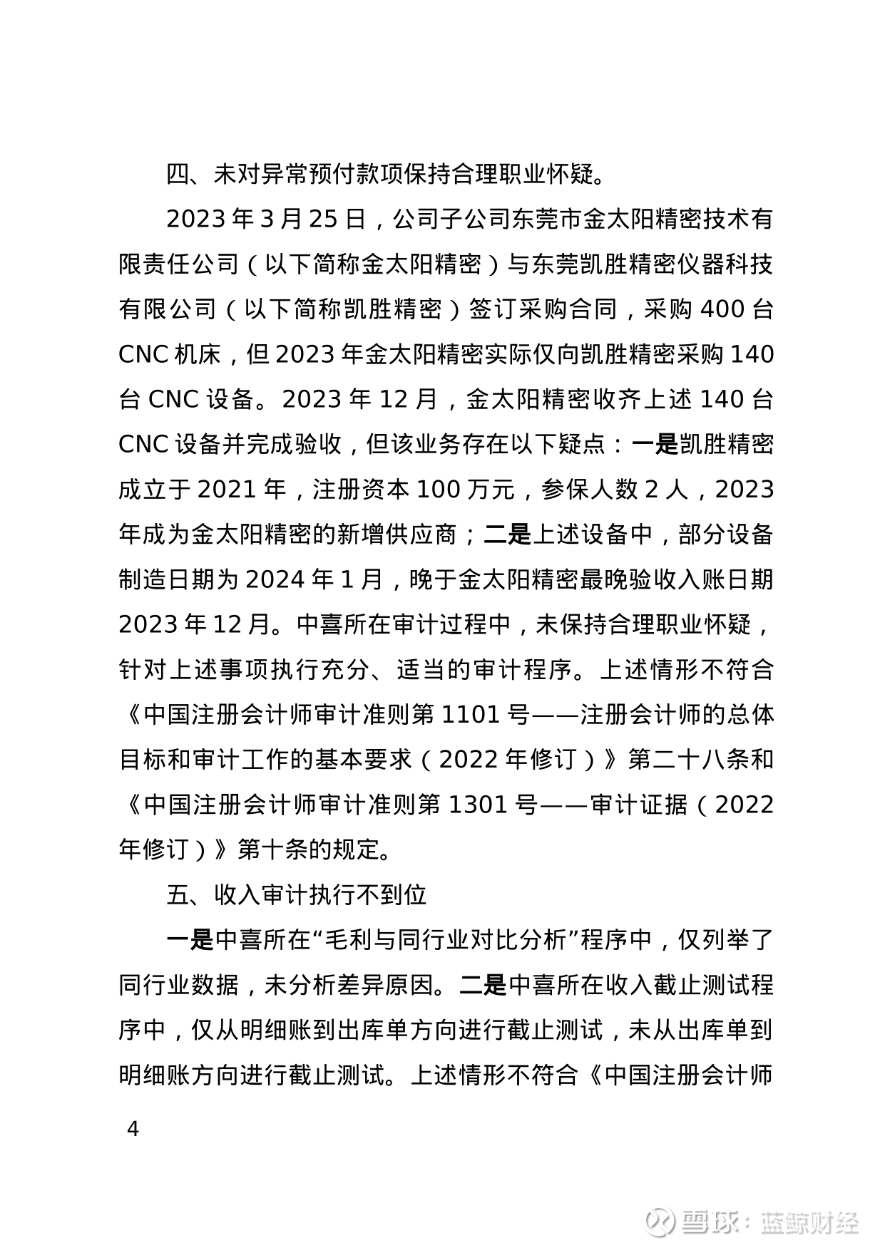 决定书显示,中喜会计师事务所(特殊普通合伙)在对东莞金太阳研磨股份有限公司2023年年报审计工作中存在多项问题。包括风险评估程序执行不充分、控制测试程序执行不到位、函证程序执行不到位、未对异常预付款项保持合理职业怀疑、收入审计执行不到位以及其他问题,如未执行会计分录测试和独立性声明签署日期晚于规定时间。