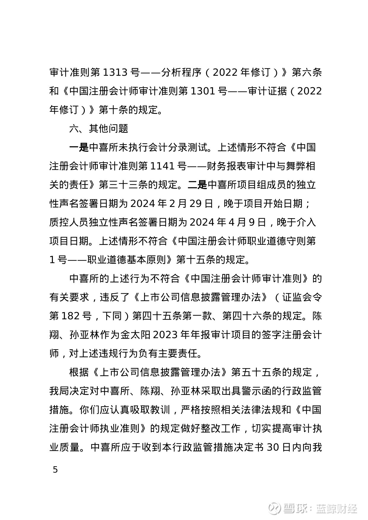 上述行为不符合《中国注册会计师审计准则》的有关要求,违反了《上市公司信息披露管理办法》的规定。陈翔和孙亚林作为金太阳2023年年报审计项目的签字注册会计师,对上述违规行为负有主要责任。