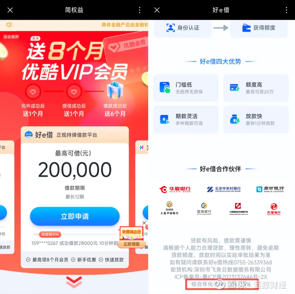 优酷视频APP-我的-借钱(简权益)正在做活动,最高送8个月优酷VIP会员(完件成功后送1个月,授信成功后送1个月,借款成功后送6个月)。优酷借钱合作引流的“好e借”页面显示,综合年化利率7%-36%,合作伙伴包括:华夏银行、中关村银行、廊坊银行、华瑞银行、蓝海银行、云南信托、东莞银行。
