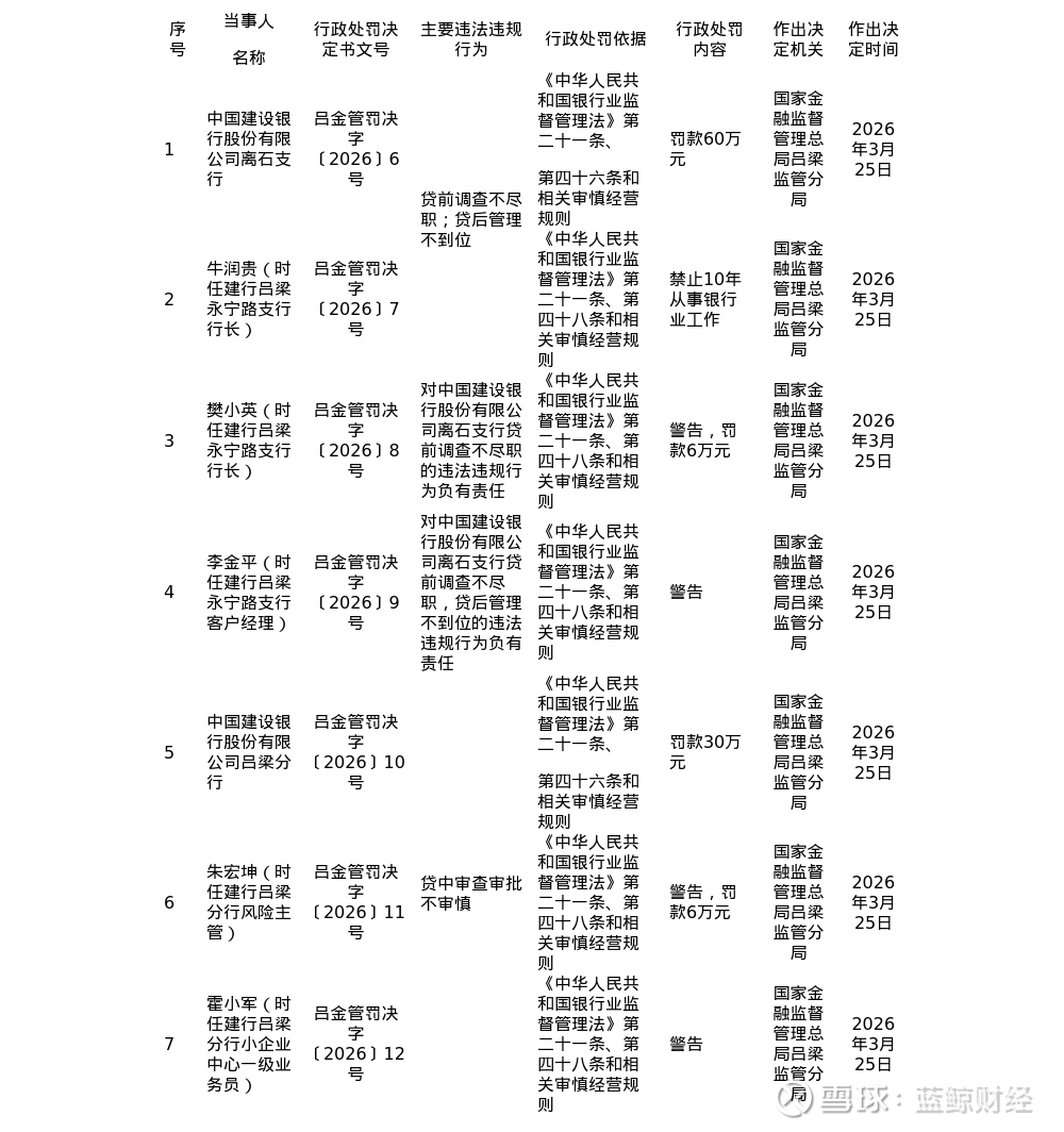 蓝鲸新闻3月31日讯,近日,国家金融监督管理总局吕梁监管分局发布了多张罚单,剑指中国建设银行股份有限公司离石支行、吕梁分行及其相关责任人。
