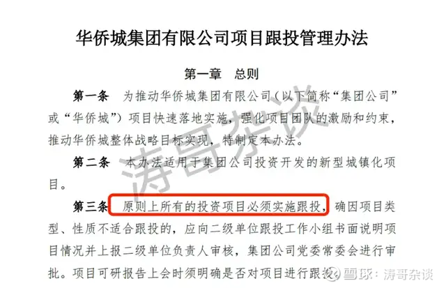 2019年,华侨城下发了《华侨城集团有限公司项目跟投管理办法》,强制二级单位负责人及项目关键骨干按规定跟投。