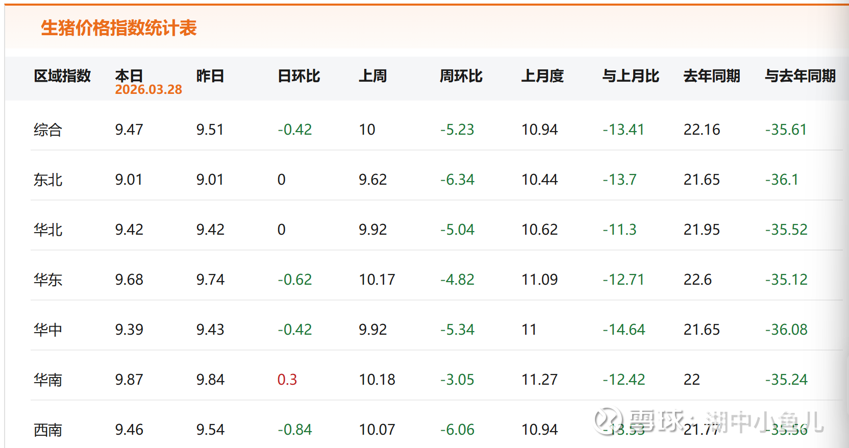 一、生猪现价:2026.03.28 综合指数值 9.47元/公斤