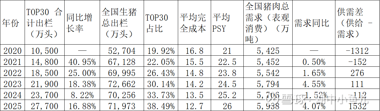 2020年-2025年TOP30规模猪场年出栏量、市占率平均完全成本(数据来源豆包)