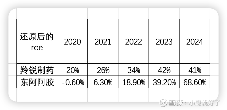 可以看到还原后,羚锐的roe逐年改善,2024年的羚锐要比5年前优秀很多;东阿阿胶在处理完历史库存后,净资产收益率非常优秀,后续也有望继续保持增长;