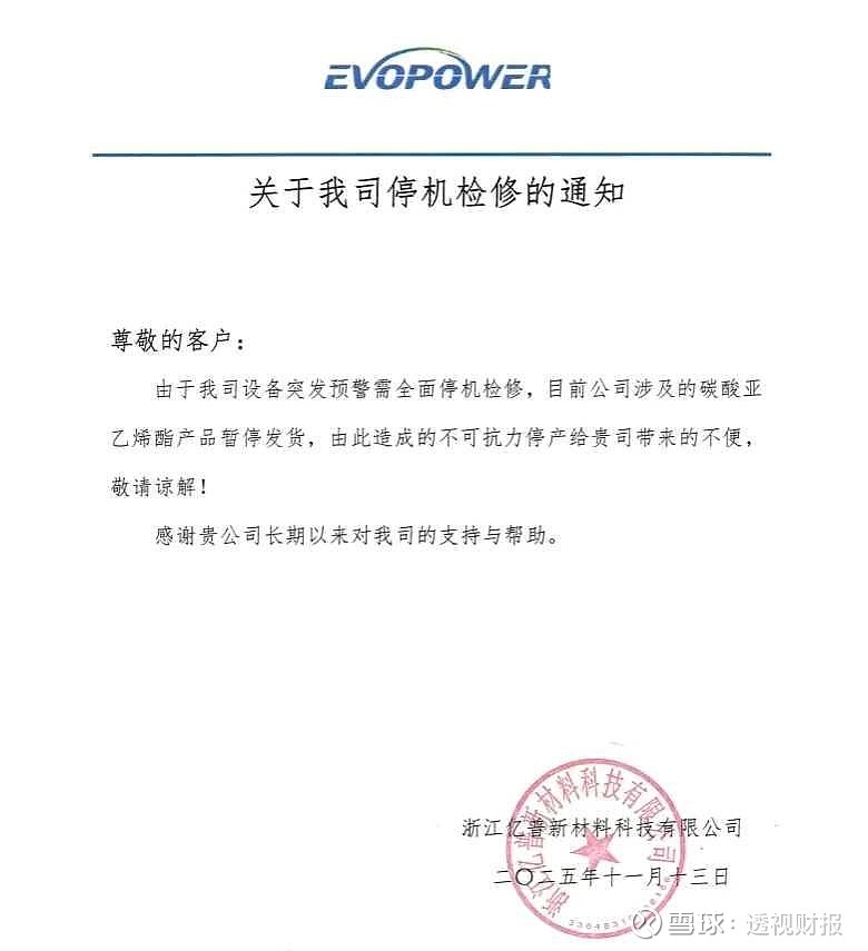 11月13日,浙江亿普发布停产公告。公告称由于设备突发预警需全面停机检修,目前VC产品停止发货!这家公司VC产能3200吨。这是继山东亘元停产后,又一家同行公司发布的停产公告!这让本来产能就紧张的VC再次雪上加霜,下周价格暴涨是必然的事情!$永太科技(SZ002326)$ $华盛锂电(SH688353)$ $海科新源(SZ301292)$